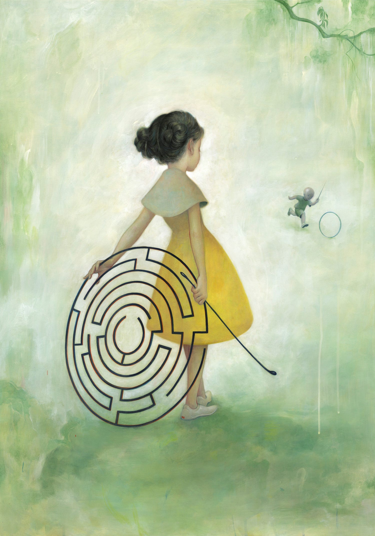 Two years ago, I got to see the piece that started it all, Maze, in person at a gallery in Seoul. I drank in Jeans' sketchbook pages, the towering canvases that stretched across an entire wall, the fantastical imagery that had first drawn me in with its subtle weaving of Asian motifs into surreal, magical concepts. His work had been one of my early inspirations in its compressed, pixelated form on some art aggregation blog, and now I was standing in front of the piece itself on a film-related work trip halfway around the world. It was dizzying.